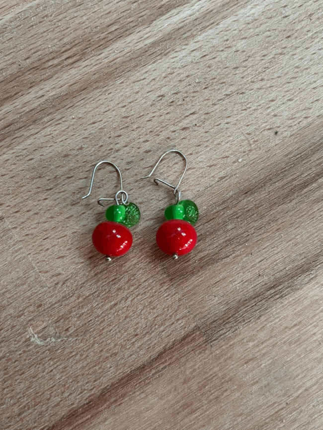 Boucles d'oreilles cerise rouge (perle + feuille)